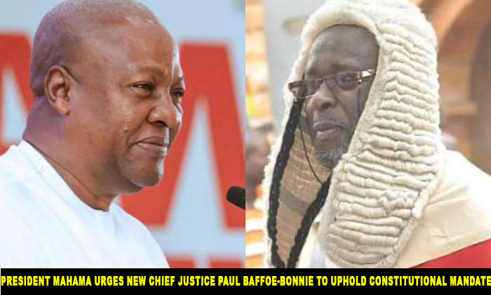 President John Dramani Mahama has called on newly sworn-in Chief Justice Paul Baffoe-Bonnie to uphold the constitutional mandate of the Judiciary and reinforce public trust in Ghana’s justice system.